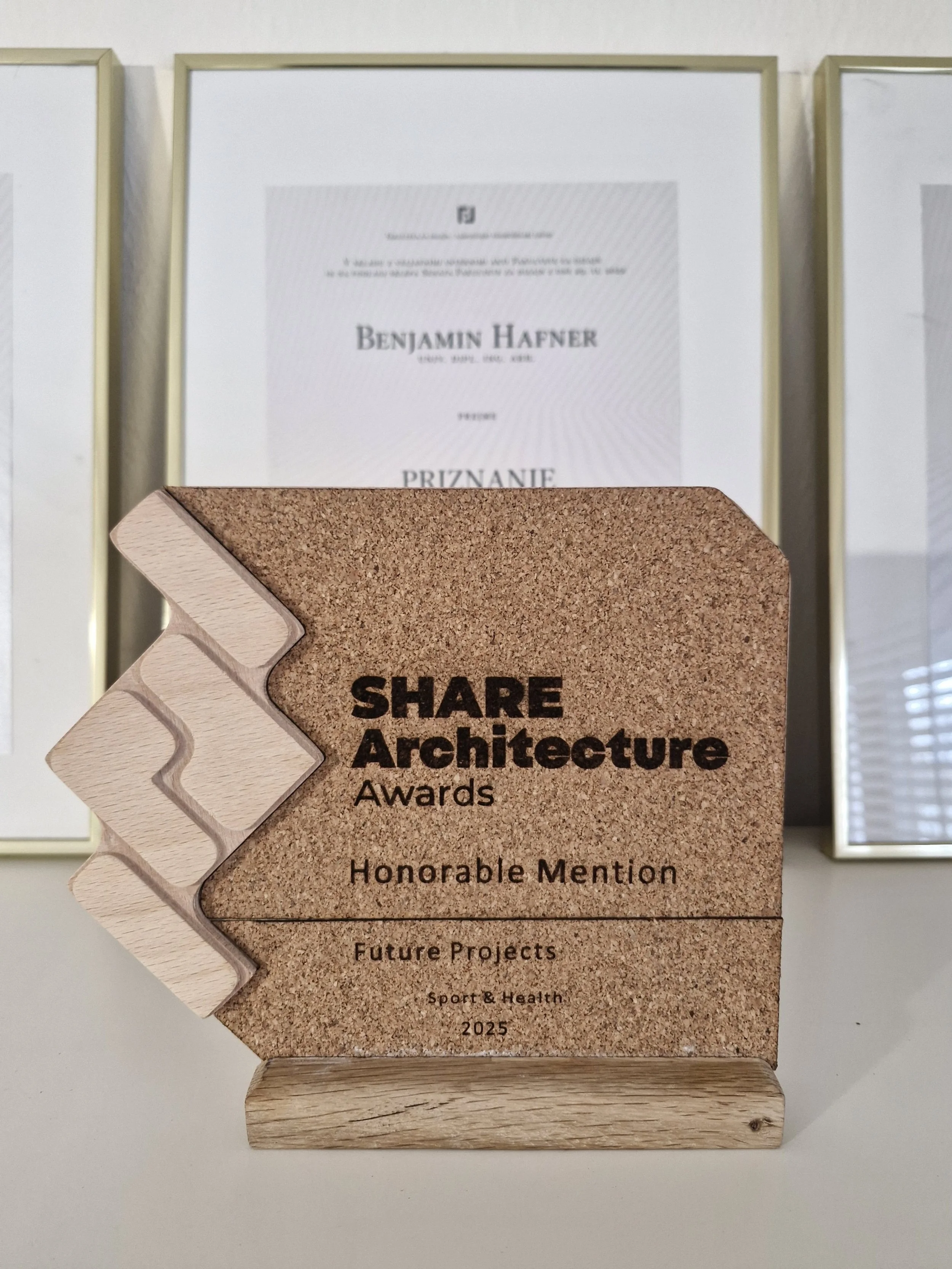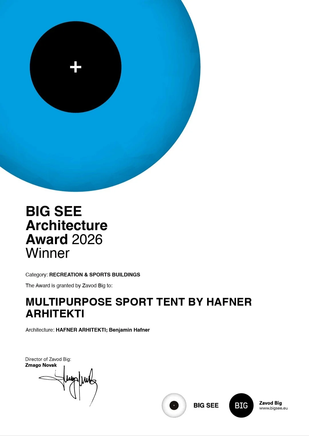 Večnamenska športna šotorska hala se je med 250 prispelimi projekti iz 20 držav osrednje in jugo-vzhodne Evrope, Kavkaza ter Centralne Azije uvrstila med finaliste “SHARE Architecture Awards 2025”. Nominacija je priznanje za izjemno kakovost, izvirnost in vizijo izvedenega projekta. Predstavitev projekta bo potekala med 3 in 5 decembrom v Dornbirnu v Avstriji.